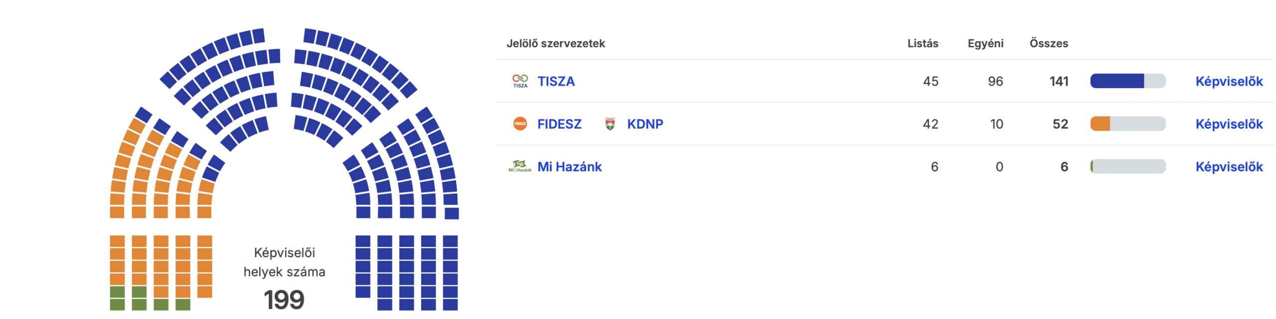Országos szinten a feldolgozottság elérte a 99,66%-ot, a végeredmény pedig egyértelmű: a Tisza Párt kétharmados többséggel, 141 mandátummal nyeri a 2026-os választást. A korábbi kormánypárt, a Fidesz-KDNP 52 mandátumot szerzett, míg a Mi Hazánk Mozgalom 6 képviselővel maradt talpon a törvényhozásban. Az országos részvétel rekordszintű, 79,55%-os volt.