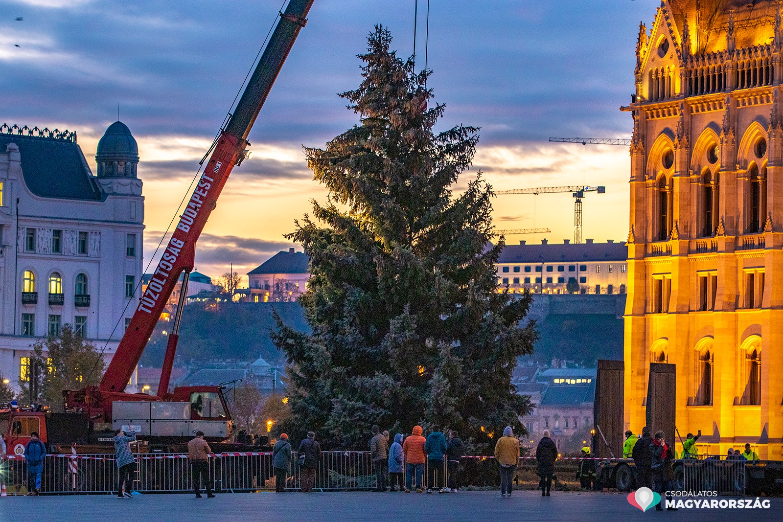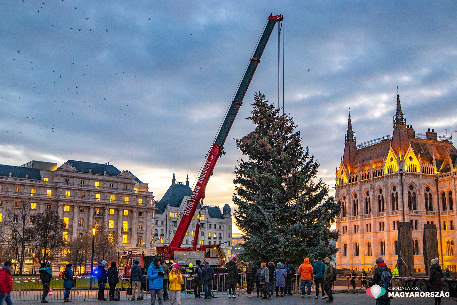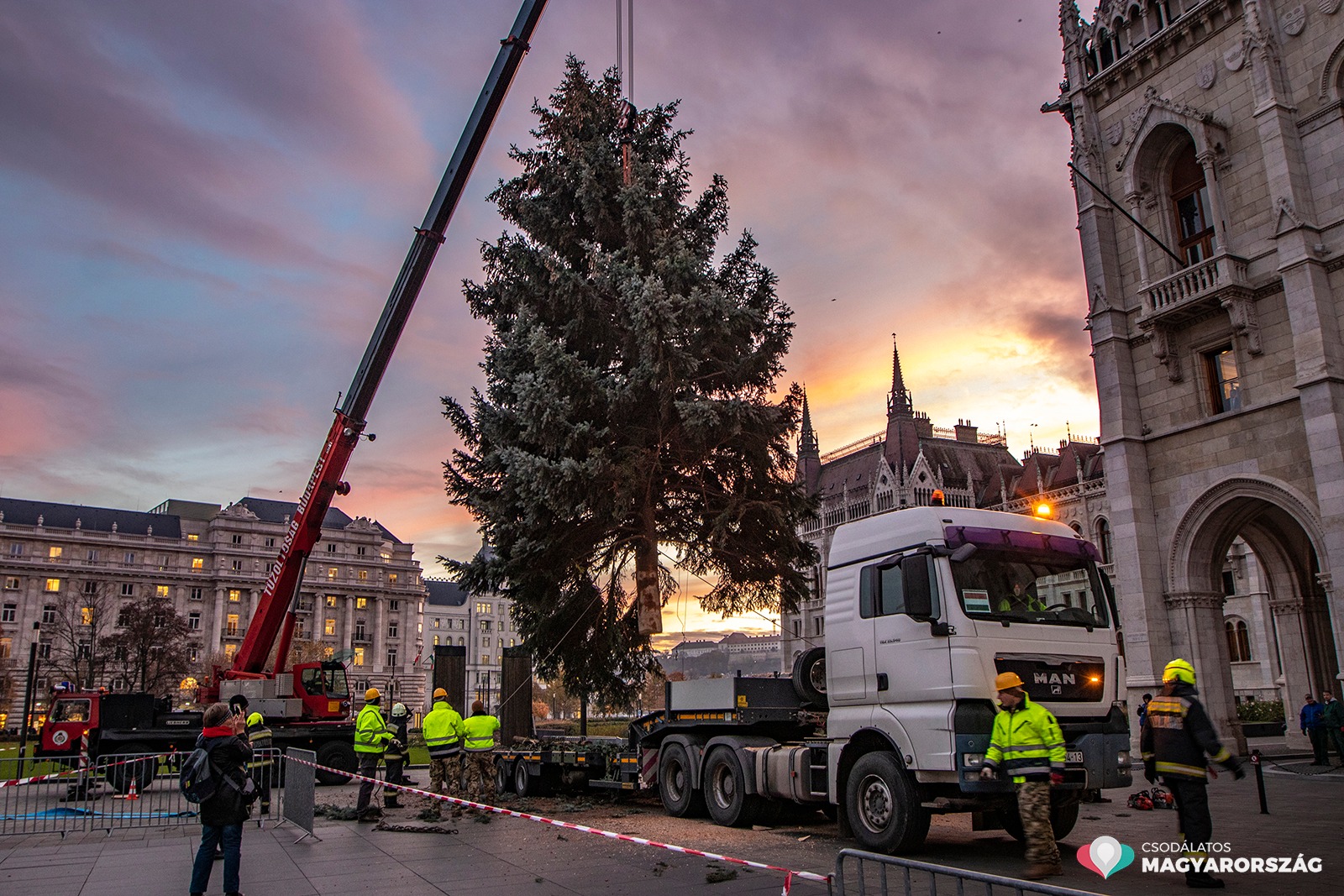 Megérkezett a Kossuth térre az ország karácsonyfája Apc településről.