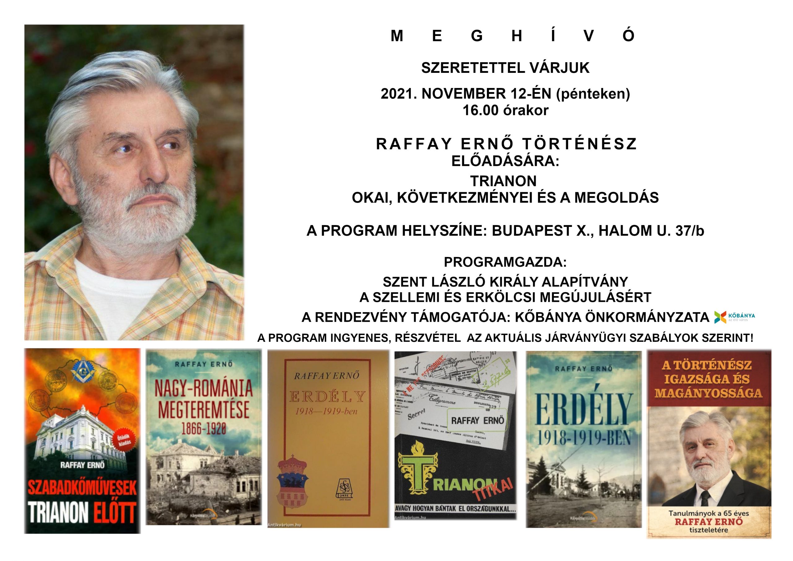 Raffay Ernő történész “Trianon okai, következményei és a megoldás” címmel tart előadást Kőbányán, november 12-én, pénteken, 16 órakor.